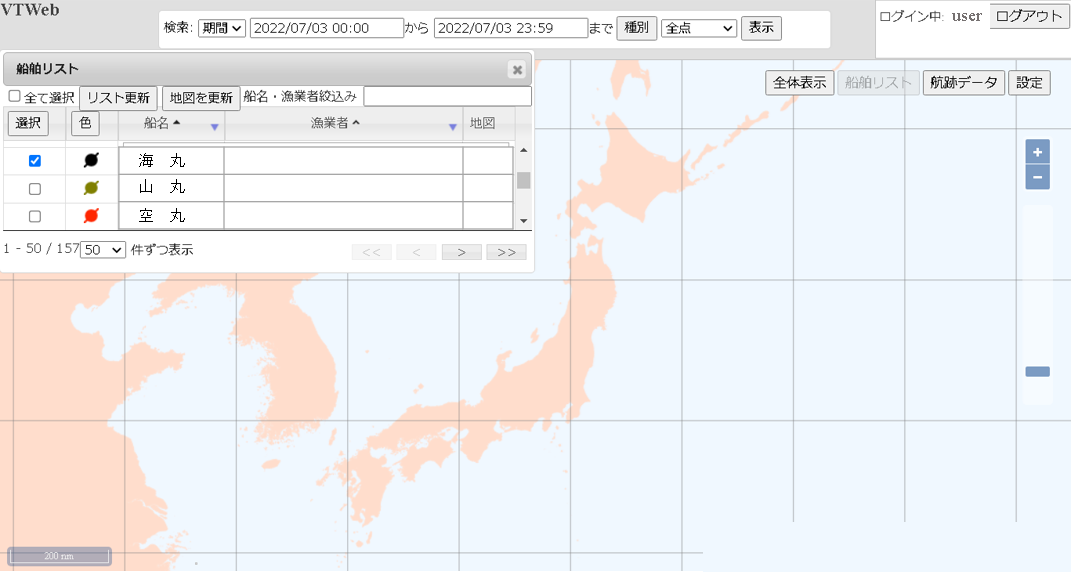 モニタリングセンターでは、VMSデータ表示専用ソフトウェアを用いて、各漁船の位置を地図上に表示します。 キュービック・アイでは、独自のソフトウェアVTWeb による船舶位置データ表示サービスを提供しています。 |