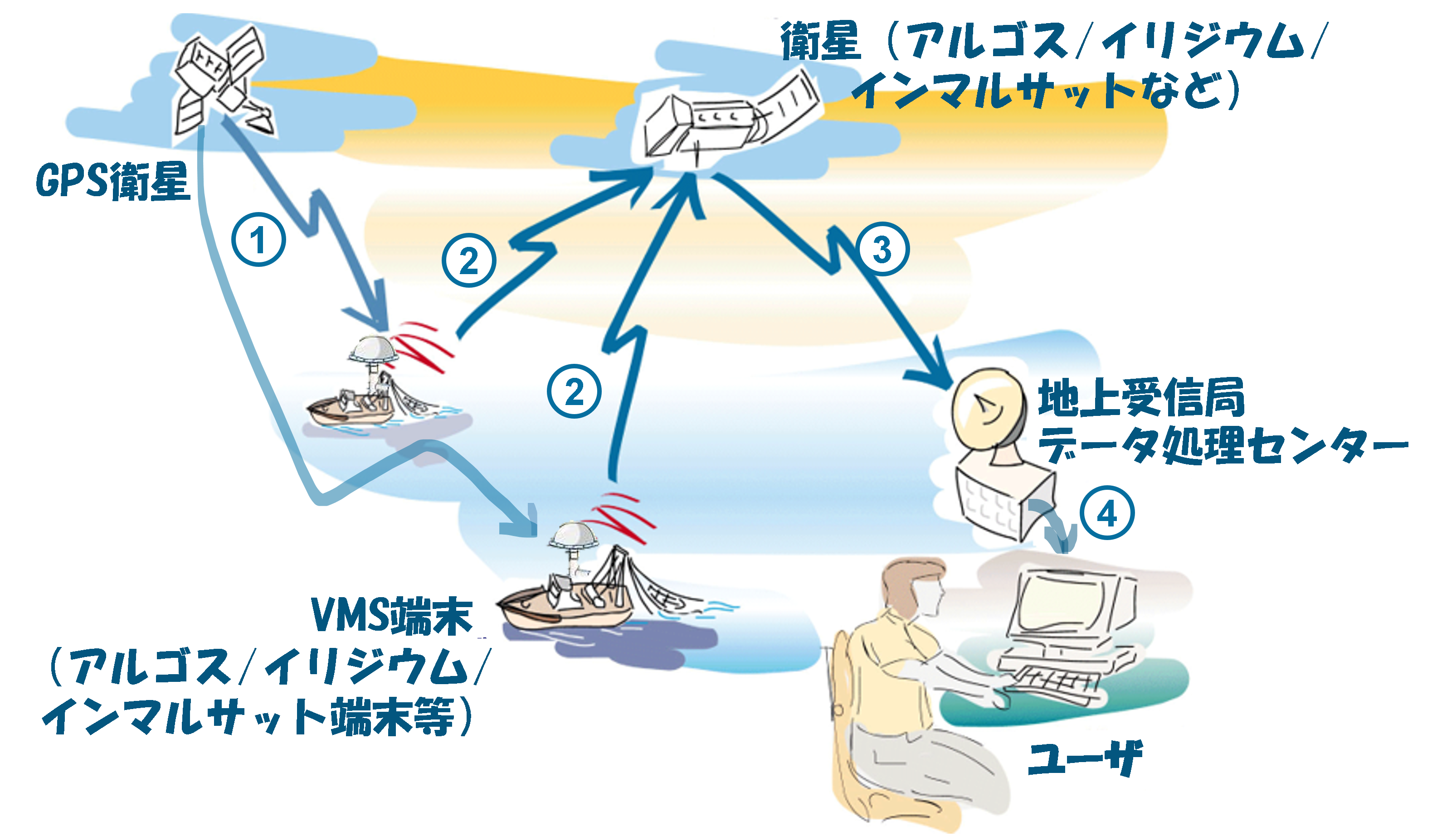 VMSデータの流れ 1.漁船上のVMS端末装置がGPS衛星の信号から自身の位置を計算 2.VMS端末装置が位置データを通信衛星に向けて送信 3.衛星で受信したデータを地上受信局で受信し、データ処理センターで処理 4.データを水産庁等のモニタリングセンターに配信 |